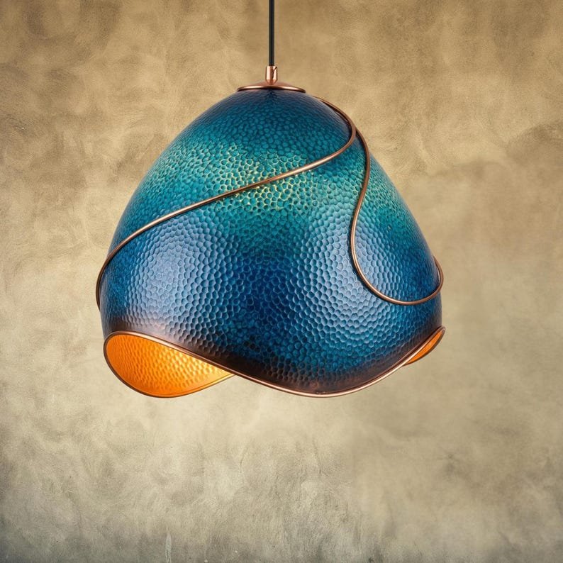 The journey of this lamp begins with a sheet of pure copper, which is painstakingly hand-hammered into a graceful, undulating dome. The exterior is then treated with a special process to achieve a stunning azure-blue and teal patina, creating a rich, textured surface reminiscent of ancient treasures weathered by sea and time. This cool, complex exterior provides a breathtaking contrast to the lamp’s hidden secret: a pure, warm hammered copper interior.