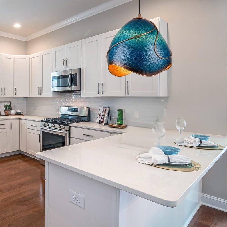 Hammered Copper Pendant Light: Azure Blue Patina, Artisan Moroccan Lighting