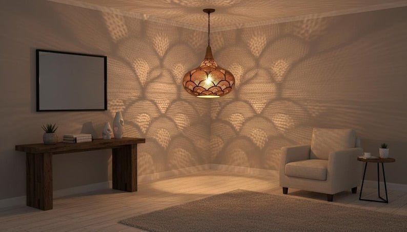 Handcrafted Moroccan Brass Pendant Light: Pierced Teardrop Boho LampHandcrafted Moroccan Brass Pendant Light: Pierced Teardrop Boho Lamp