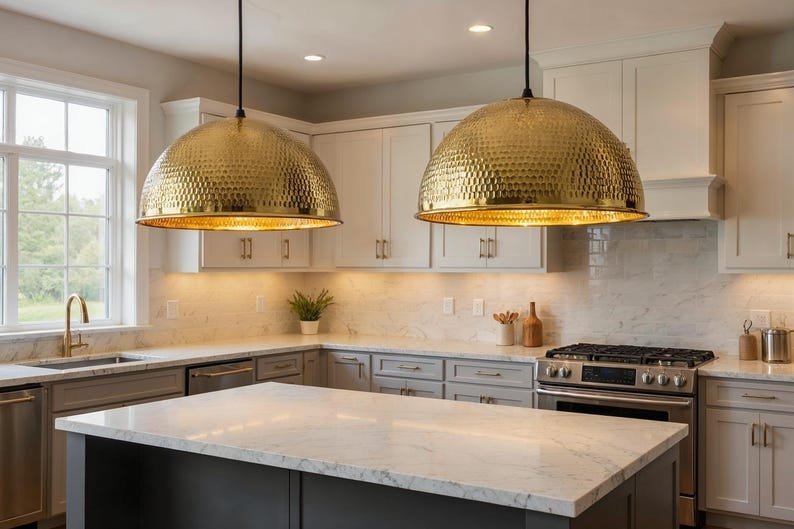 Handmade Brass Dome Pendant Light – Modern Minimalist Ceiling Lamp for Kitchen Island, Dining Room or Entryway | Moroccan Brass Lighting