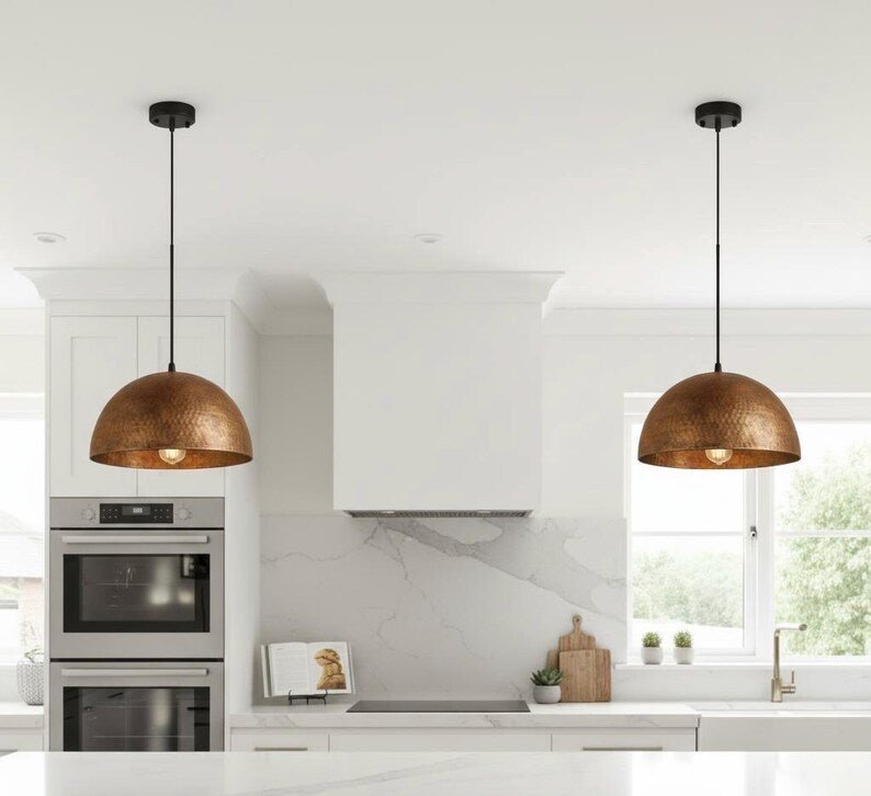 The hammered texture adds depth and dimension, catching light in a subtle, elegant way. It works beautifully over kitchen islands, dining tables, living rooms, entryways, or boutique retail spaces. The warm brass tones blend with wood, rattan, and earthy decor. Because the surface is hand-hammered, no two pieces are identical — each is an artful statement.