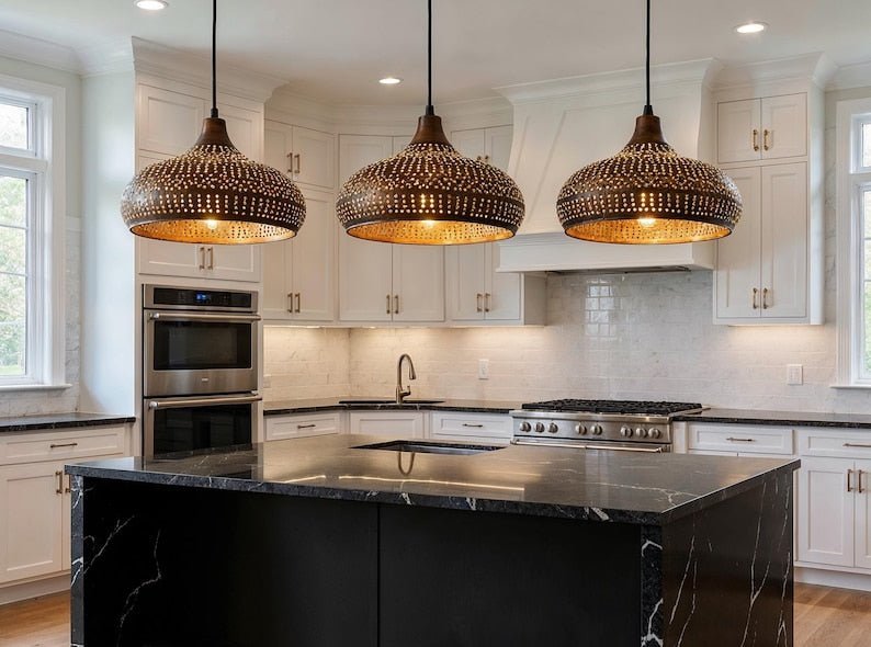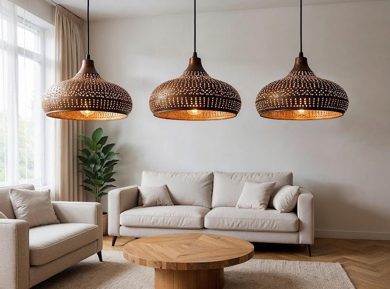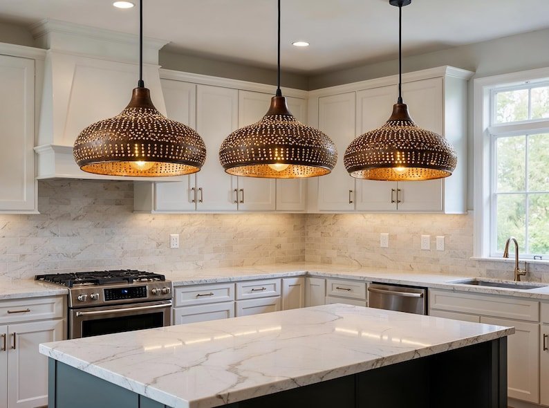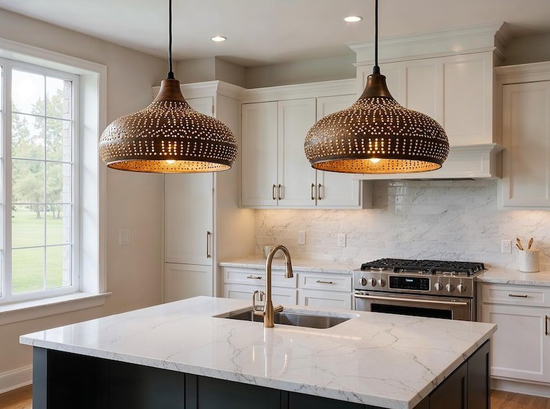 Handmade Moroccan Brass Pendant Light – Hammered Dome Ceiling Lamp, Boho Rustic Chandelier for Kitchen Island, Dining & Living Room