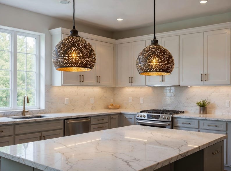 Moroccan Brass Dome Pendant Light – Handmade Hammered Ceiling Lamp, Boho Rustic Chandelier for Kitchen Island, Dining & Living Room Décor