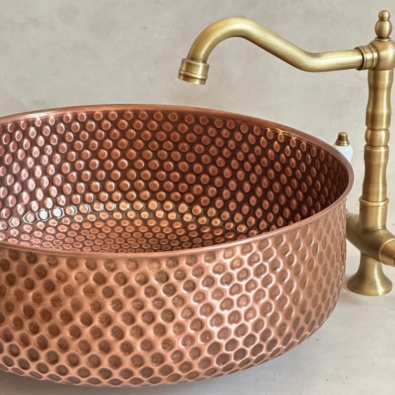 Elevate your bathroom or powder room with this stunning handmade hammered brass sink. Crafted with precision and care, this round vessel sink features a unique textured pattern that reflects light beautifully, adding a touch of luxury and sophistication to any space. The antique brass finish gives it a warm, vintage charm, perfect for rustic, bohemian, or modern farmhouse décor styles.