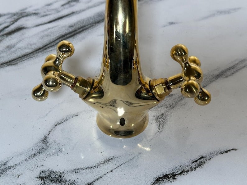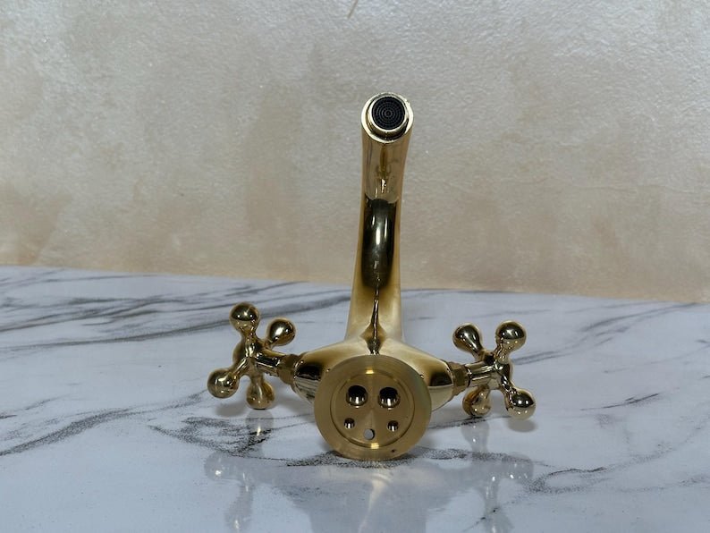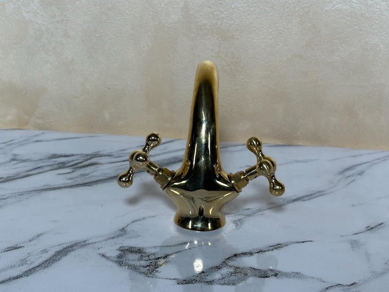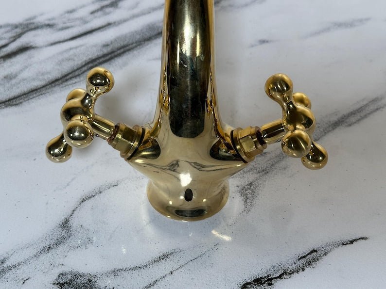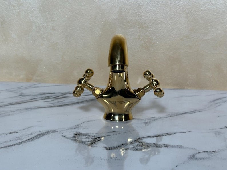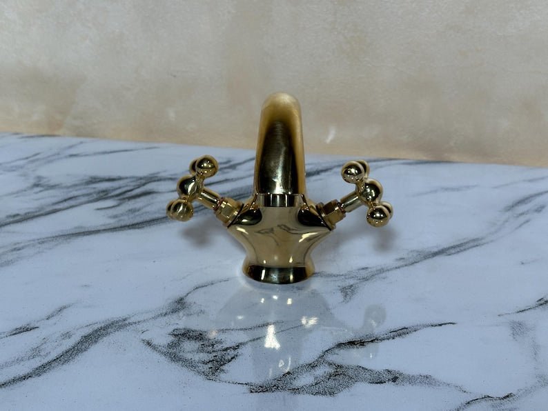 ???? Bring timeless elegance to your bathroom with this handcrafted Moroccan brass faucet, designed in a vintage-inspired shape with two beautifully sculpted cross handles and a tall arched spout. Each piece is handmade by skilled artisans in Marrakesh using solid brass—not brass-plated metal—for durability and authenticity. The design blends Moroccan charm with classic vintage appeal, making it the perfect choice for a vanity faucet, rustic bathroom fixture, or deck-mount sink tap.