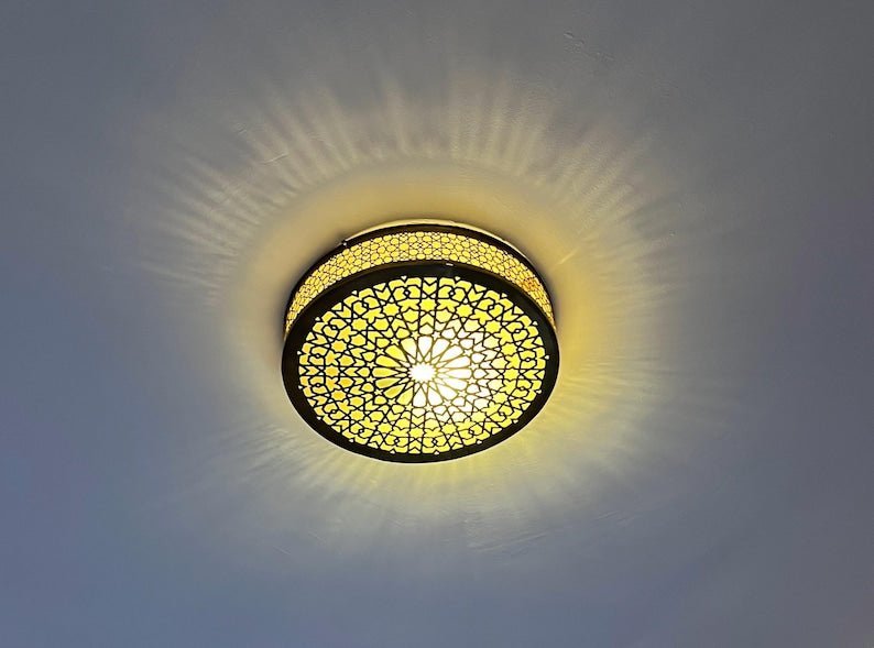 Each Moroccan flush mount is carefully handcrafted in Morocco using traditional techniques and premium materials. The polished brass cutouts create beautiful decorative light patterns on your ceiling, bringing warmth and authentic character to any interior.