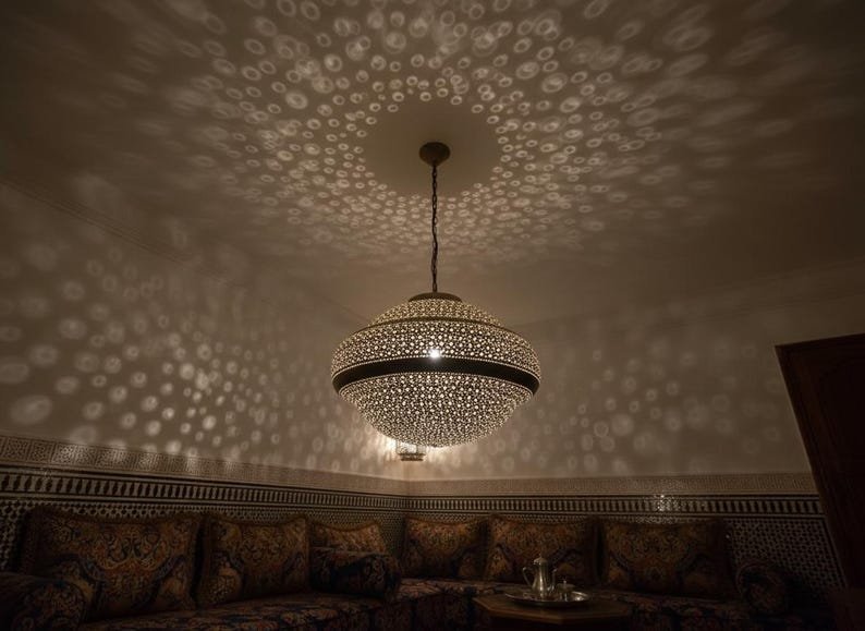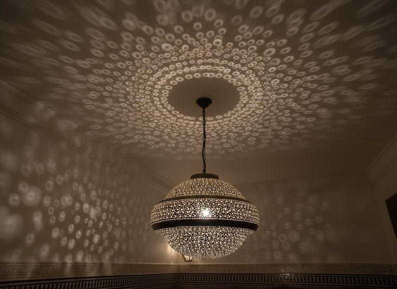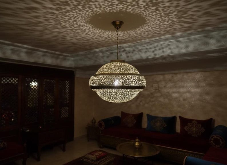Simple Moroccan pendant lamp. A stunning Moroccan style hand-made ceiling light fixture- a pendant lamp is designed to enhance the exotic beauty of your home decor. Exclusive custom lighting designs from Arabian Home Décor will ensure that this Moroccan piece of art will complement your existing décor and completely enhance the ambiance by filling in the portion of darkness while leaving the remaining area soothing and serene