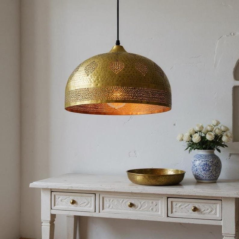 Handmade Moroccan Brass Pendant Light - Hammered Dome with Cutout PatternsHandmade Moroccan Brass Pendant Light – Hammered Dome with Cutout Patterns