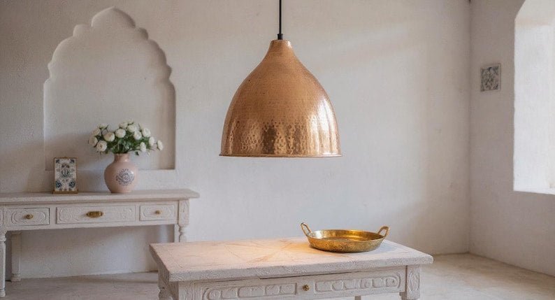 Moroccan Copper Dome Light Fixture – Handmade Ceiling Pendant Lamp, Rustic Hammered Copper Lighting for Modern Interiors