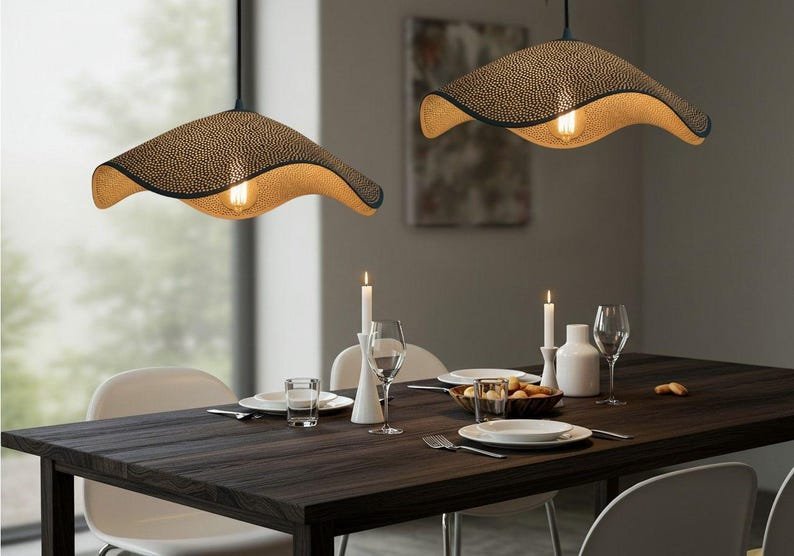 This ceiling lamp is hand-hammered by skilled artisans in Morocco using high-quality copper or brass. Its intricate perforated design creates mesmerizing shadow patterns on your walls and ceiling when lit, turning any room into a warm and inviting haven.