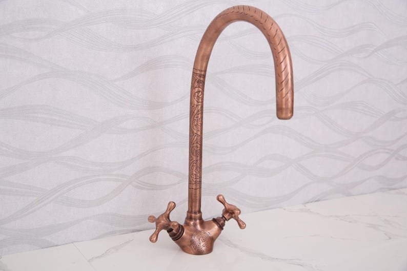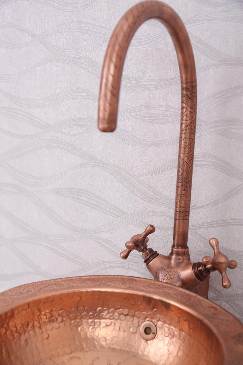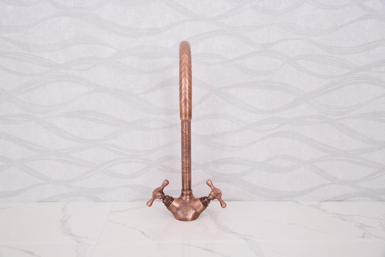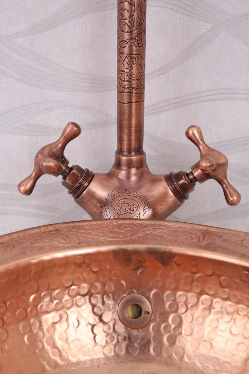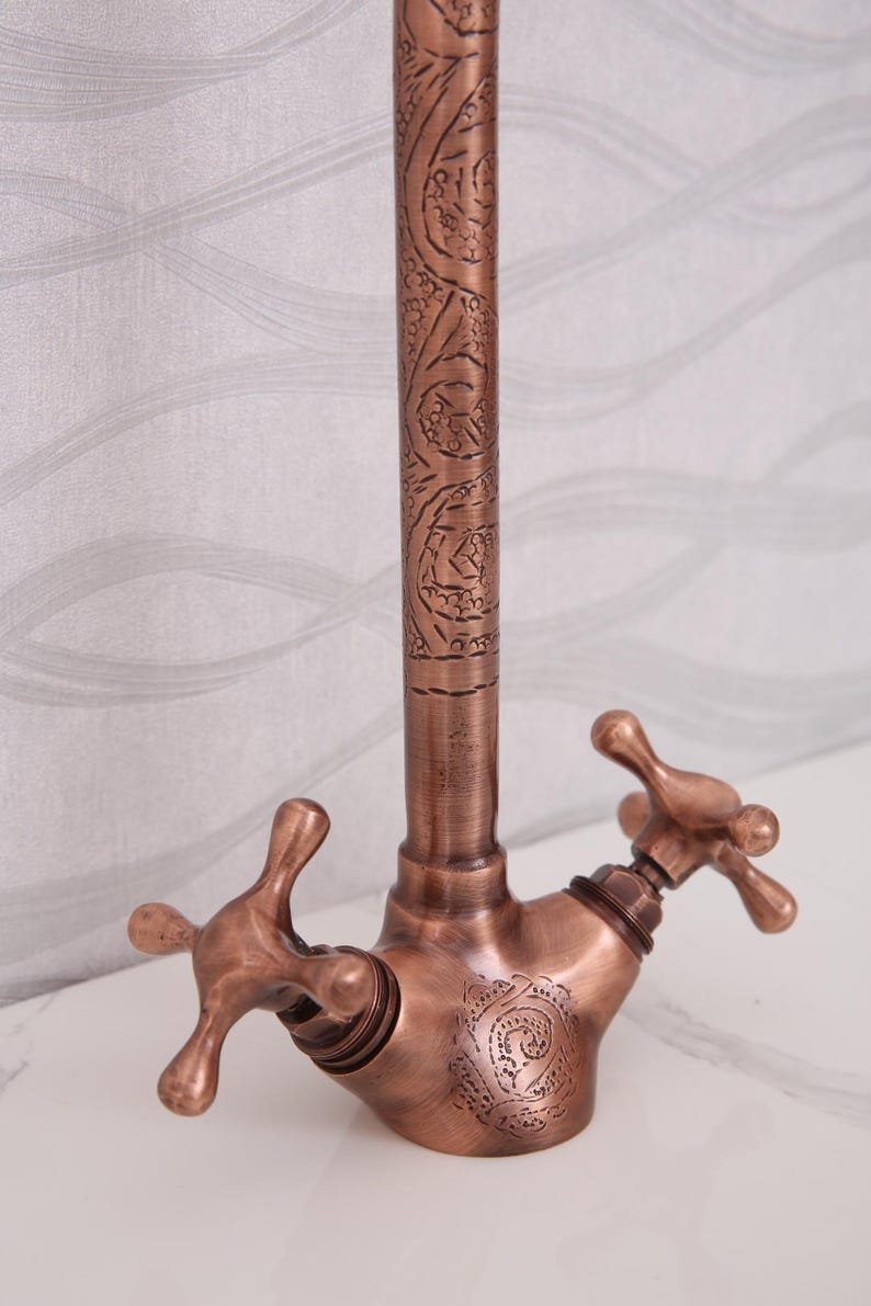 Handmade Moroccan Hammered Brass Faucet – Vintage Copper Bathroom Tap – Dual Handle Sink Fixture – 32cm Tall Artisan HardwareHandmade Moroccan Hammered Brass Faucet – Vintage Copper Bathroom Tap – Dual Handle Sink Fixture – 32cm Tall Artisan Hardware