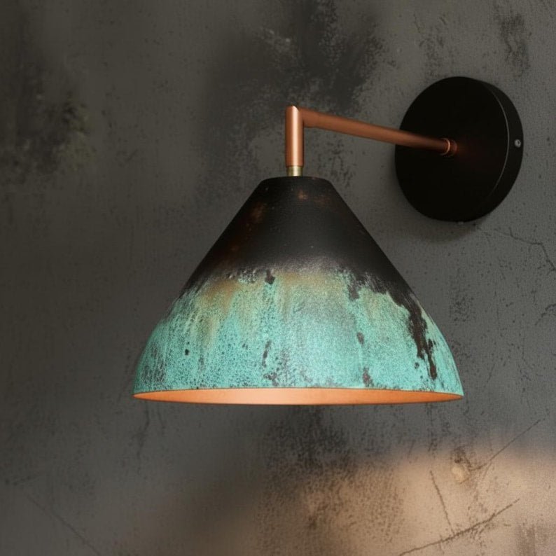 Elevate your space with the charm of handcrafted design. This hammered copper wall sconce features a beautiful green patina finish, oxidized by hand for an authentic vintage look. Each piece is truly unique, with natural variations in texture and tone.