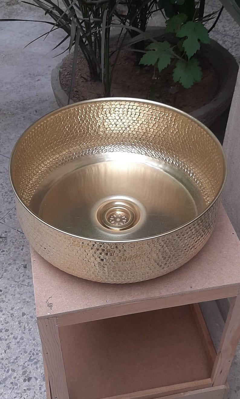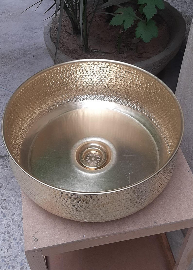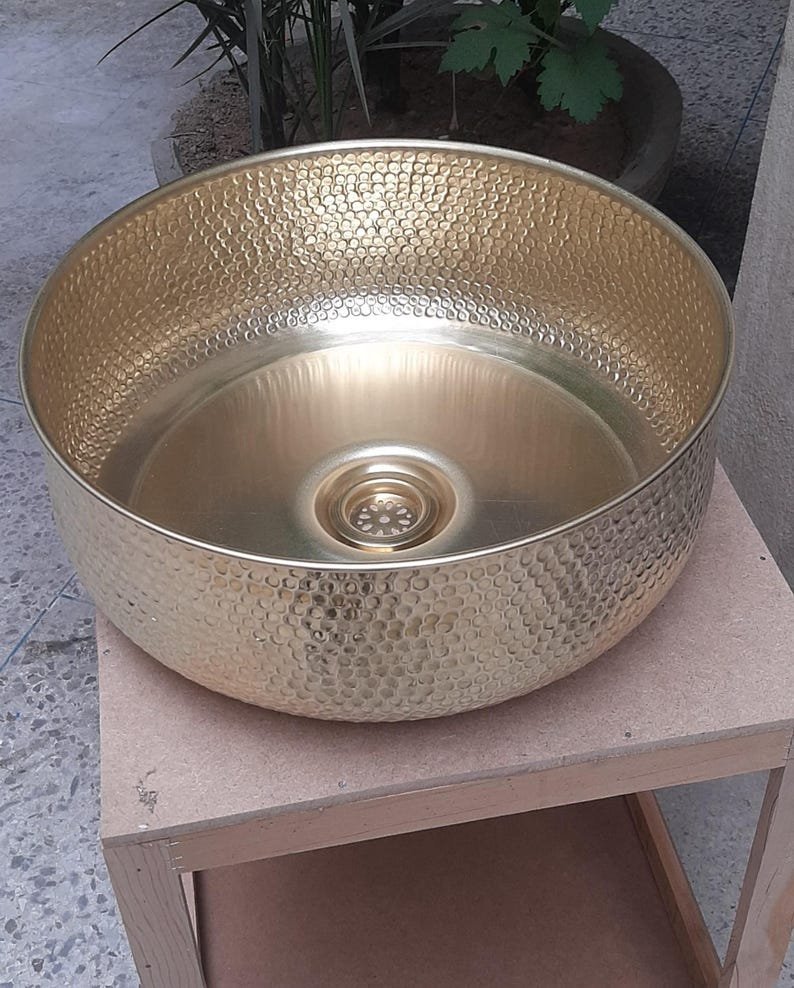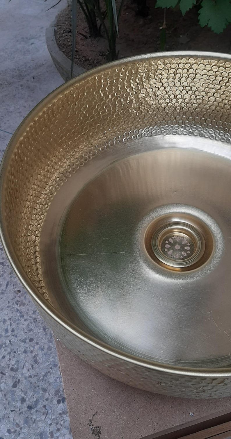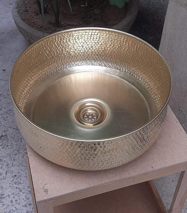 Luxurious Hammered Brass Round Sink – Handmade Above Vanity Bathroom Sink, Countertop Basin with Warm Brass Tone, Moroccan Home DecorLuxurious Hammered Brass Round Sink – Handmade Above Vanity Bathroom Sink, Countertop Basin with Warm Brass Tone, Moroccan Home Decor