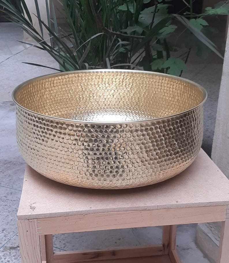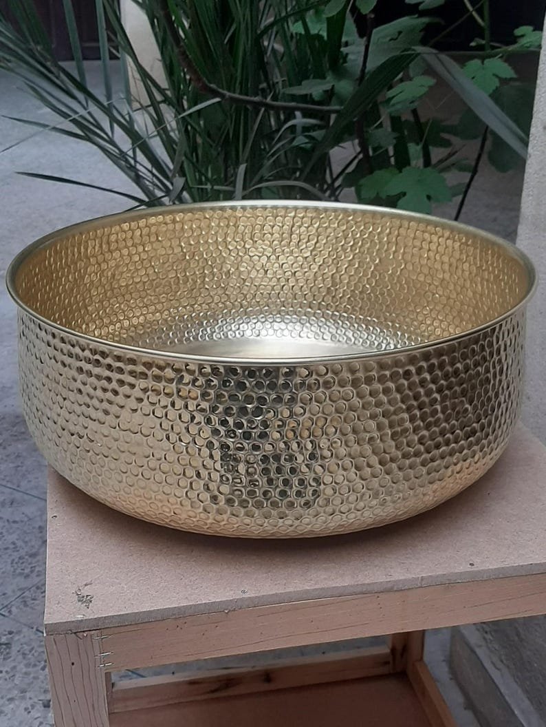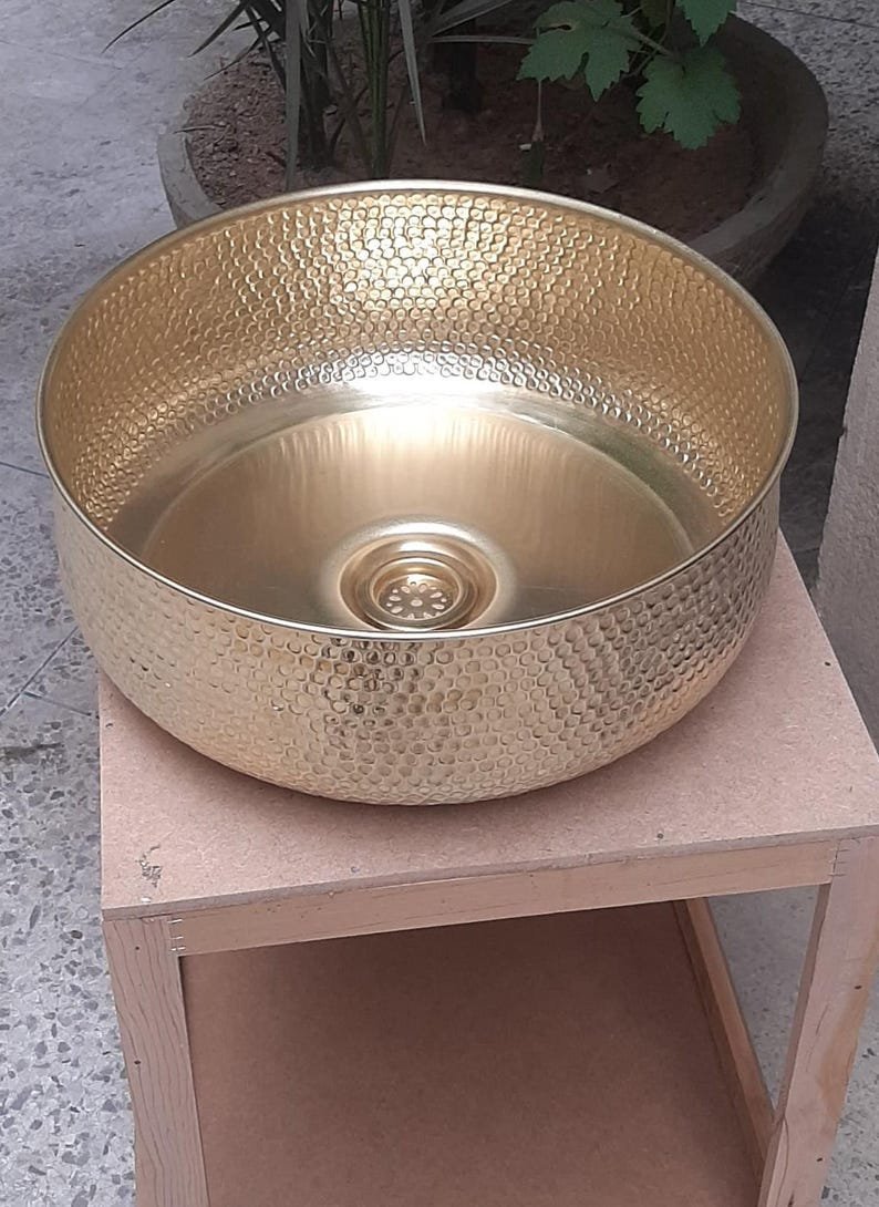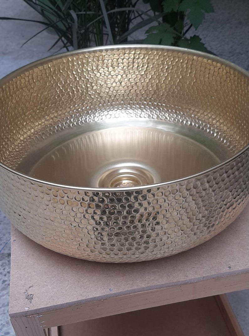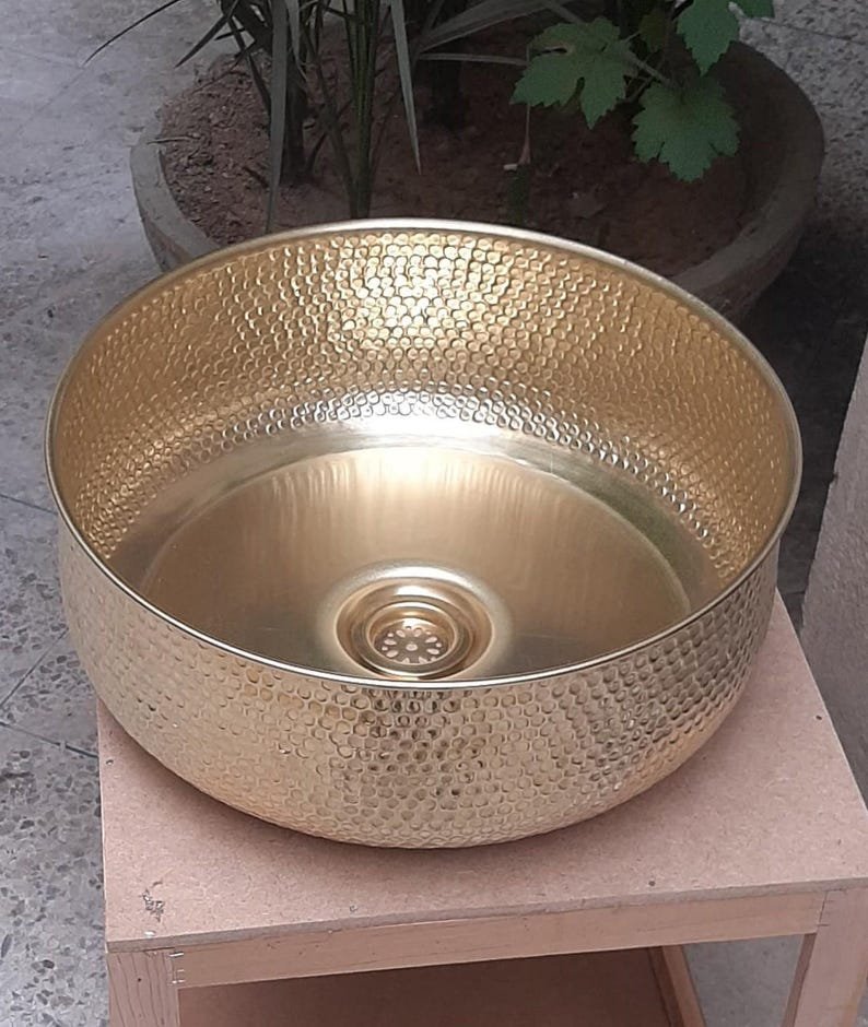 Luxurious Hammered Brass Round Sink – Handmade Above Vanity Bathroom Sink, Countertop Basin with Warm Brass Tone, Moroccan Home DecorLuxurious Hammered Brass Round Sink – Handmade Above Vanity Bathroom Sink, Countertop Basin with Warm Brass Tone, Moroccan Home Decor