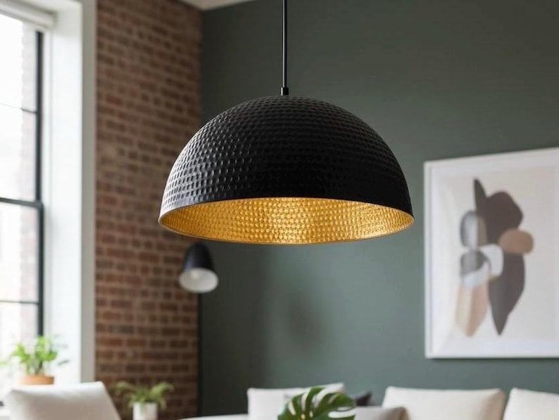 This handmade black brass pendant light features a hammered dome shape with a matte black exterior and warm golden interior that casts a cozy glow. Its modern yet timeless design makes it perfect for kitchens, dining rooms, living rooms, or even restaurants and cafés.