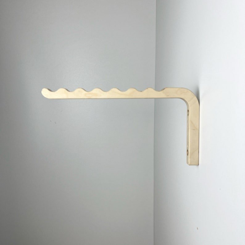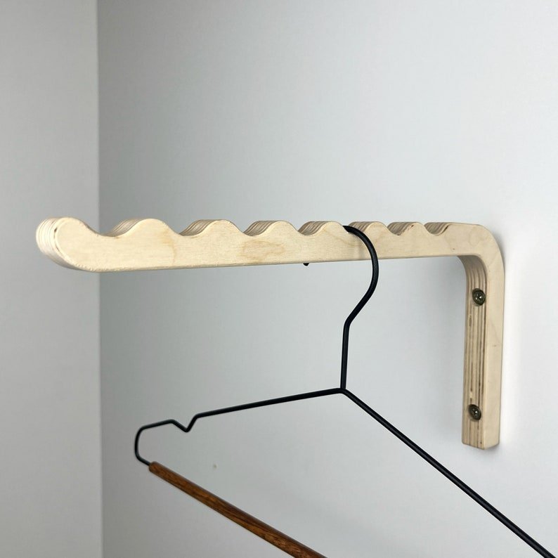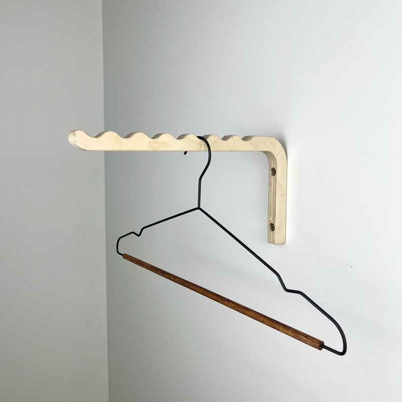 Introducing our versatile wall mount clothes hanger rack, a practical solution for your storage needs. Crafted with durable plywood, this t-shirt hanger is perfect for your closet or laundry room. Its simple minimalist design adds style to any space, from your entryway to your office. With its valet hook for the wall, this Brass rack keeps your clothes organized and easily accessible. Say goodbye to clutter and hello to convenience with this unique closet storage rack!