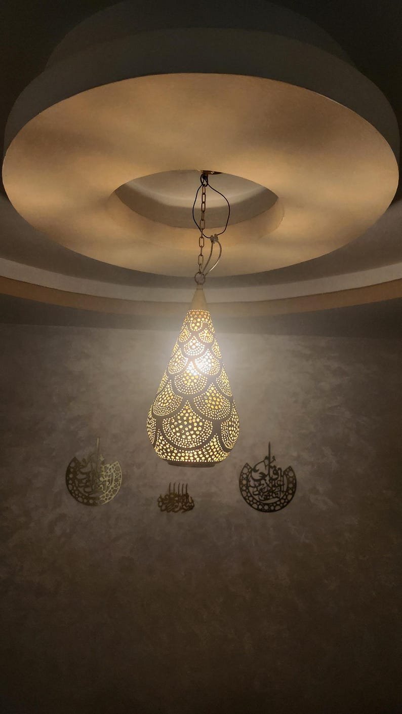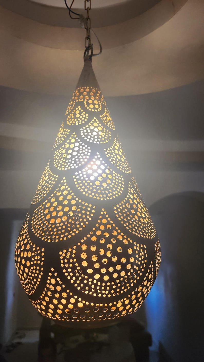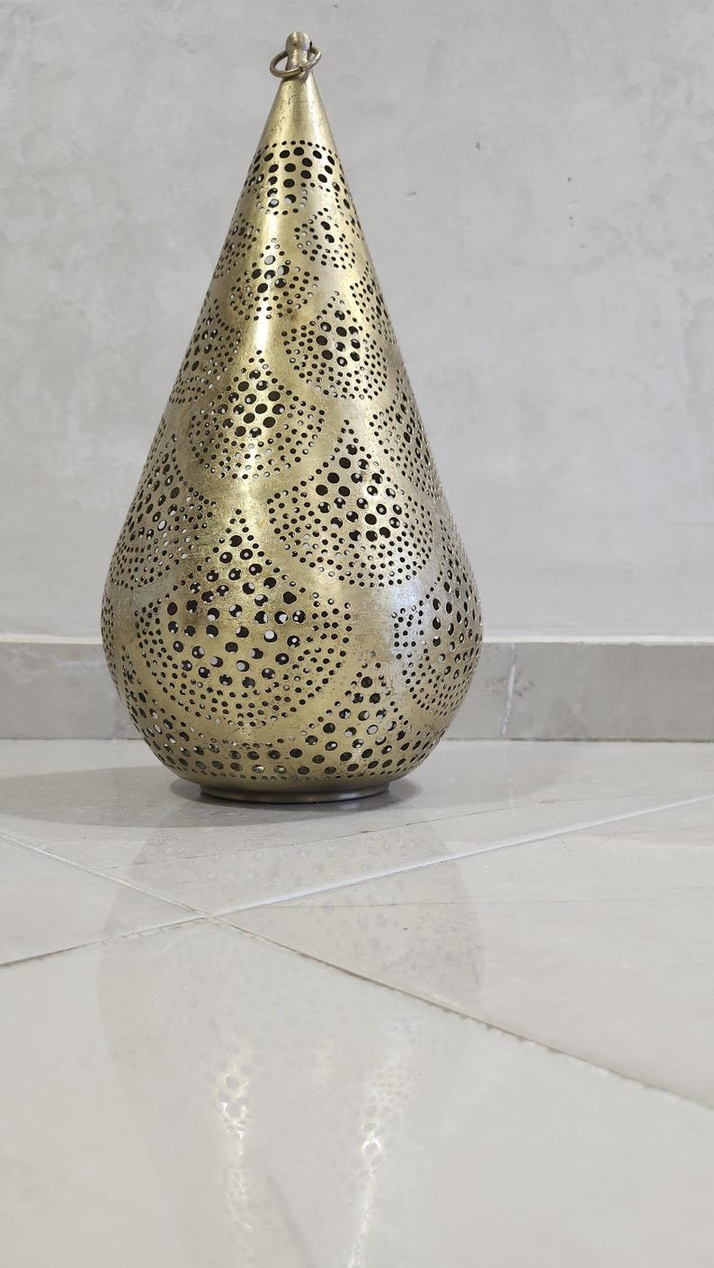 Bring authentic Moroccan design into your home with this Moroccan Brass Ceiling Light, a stunning boho pendant lamp handcrafted by skilled artisans. Its unique teardrop lantern shape and intricate perforated patterns project magical shadows across your walls and ceiling, creating a cozy yet elegant atmosphere.