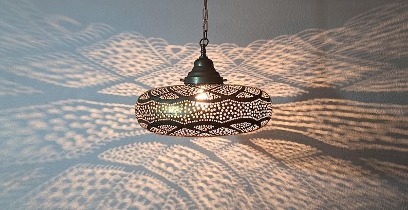 Simple Moroccan pendant lamp. A stunning Moroccan style hand-made ceiling light fixture- a pendant lamp is designed to enhance the exotic beauty of your home decor. Exclusive custom lighting designs from Arabian Home Décor will ensure that this Moroccan piece of art will complement your existing décor and completely enhance the ambiance by filling in the portion of darkness while leaving the remaining area soothing