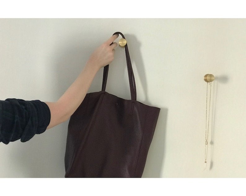 I designed this hook for my studio after some other hooks (I won’t say where I got them) fell out of my wall. This natural brass hook has some heft (since it is solid metal), and there are three concealed wall screws, meaning it will stand up to everything you can throw at (and on) it.