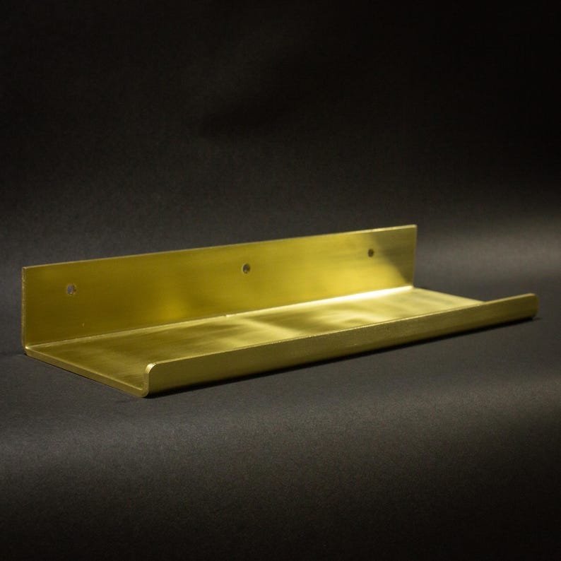 A minimal, heavy-duty brass shelf designed for form and function. Crafted from solid .08″ American brass, this piece features a clean silhouette, gently rounded front edge, and optional 1/2″ lip for added security. Built for display or utility in any space, bathroom, kitchen, hallway, or gallery wall.