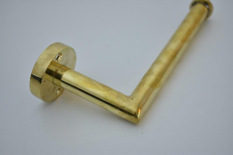 Transform your bathroom with this handcrafted wall-mounted toilet paper holder made from premium solid unlacquered brass. The natural raw brass finish develops a beautiful living patina over time, giving each piece unique vintage character that becomes more stunning with age.