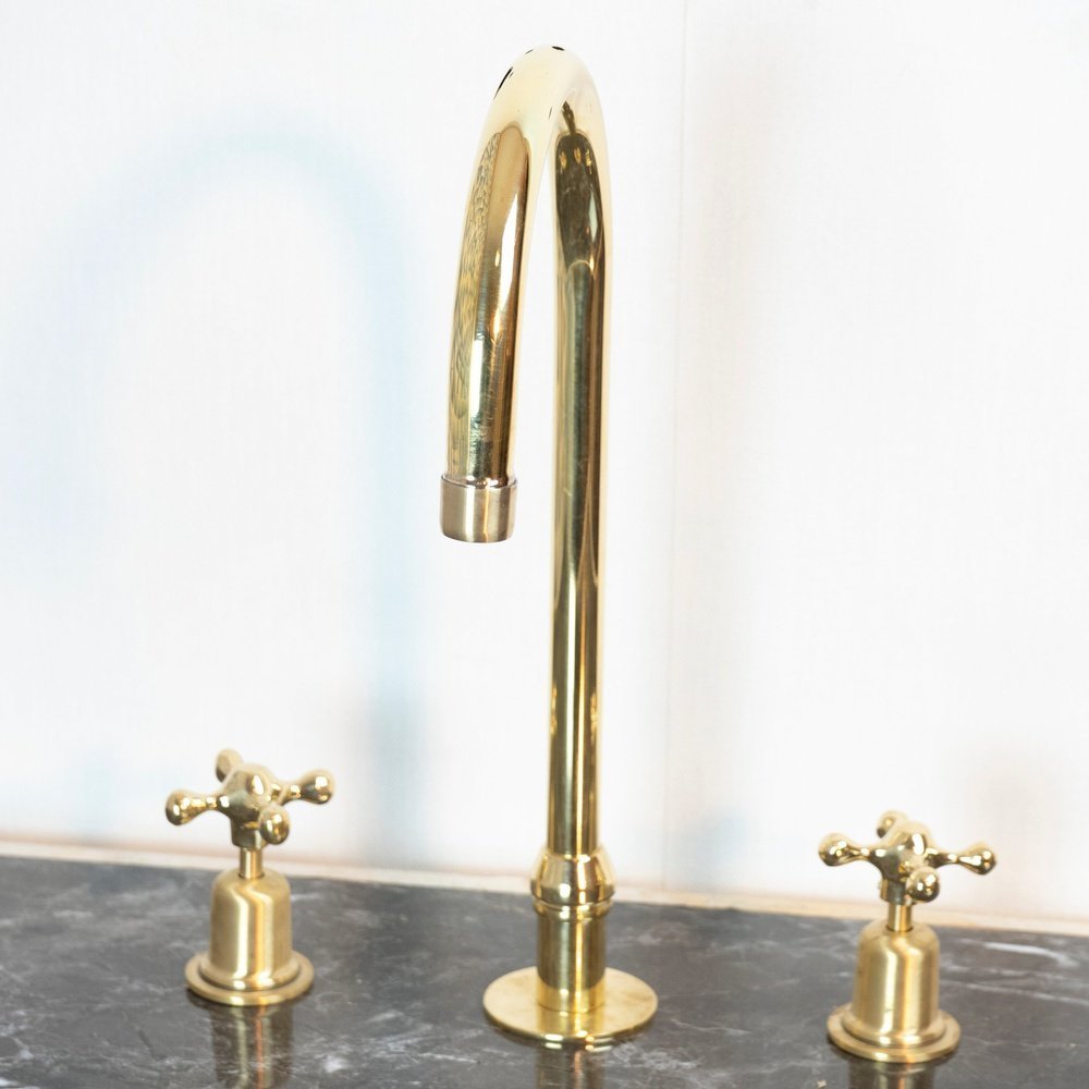 The Bell Widespread Unlacquered Brass Kitchen Faucet, with Flat cross handles, has a gooseneck shape that extends over your sink for a streamlined look and feels. The design of this solid brass product is inspired by the shape of the medina’s door, Traditional cross handles to control the temperature and water flow.