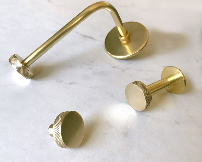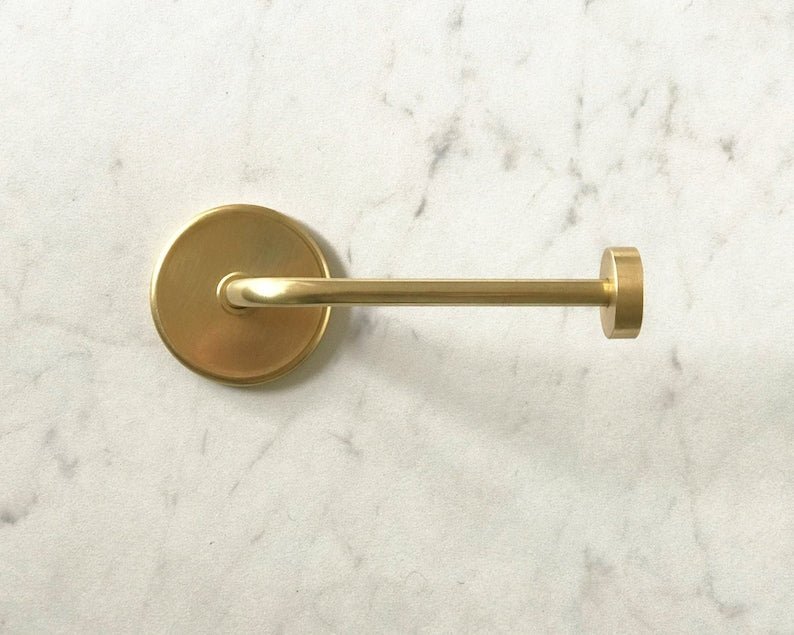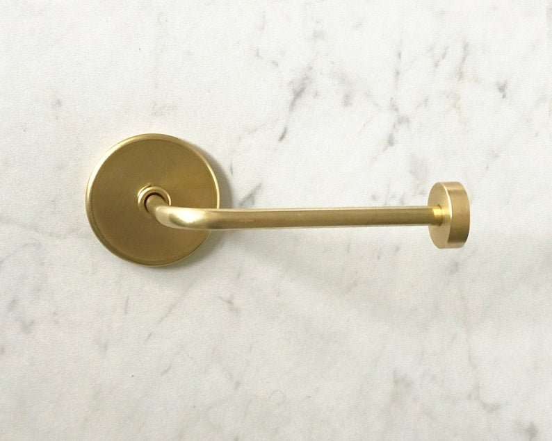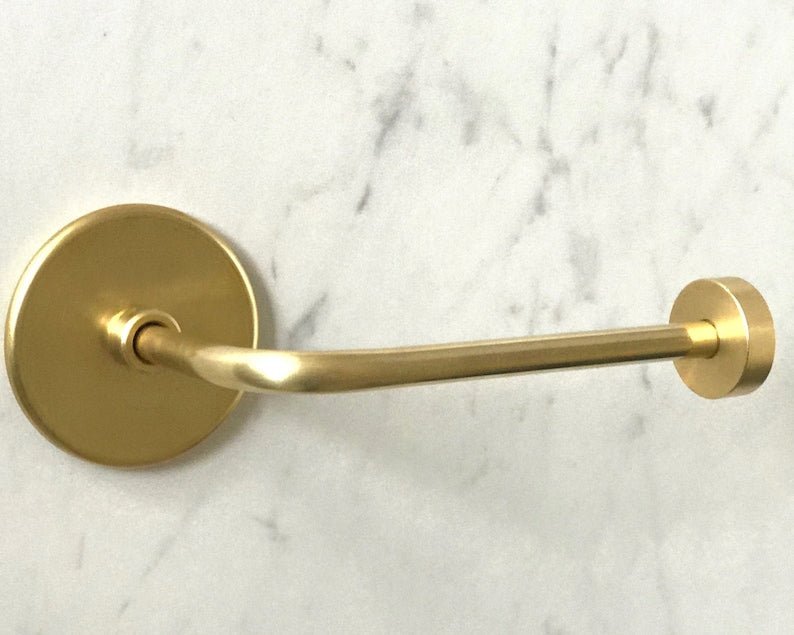 I hand-craft these toilet paper holders from solid brass in my Southern California studio. I am particularly proud of this design, which pairs perfectly with the rest of our hardware 🙂