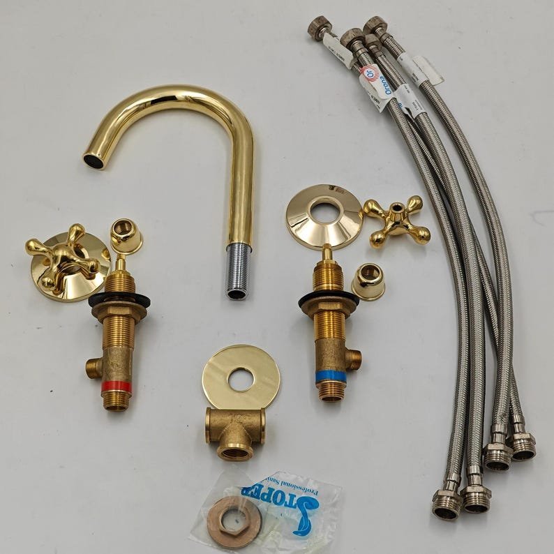 Enhance your bathroom with this elegant 3-hole brass faucet, featuring a widespread design and dual handles for precise water control. Crafted from high-quality brass for durability, this bathroom faucet adds a touch of luxury to any sink. Perfect for modern or vintage-inspired bathroom upgrades, with easy installation.