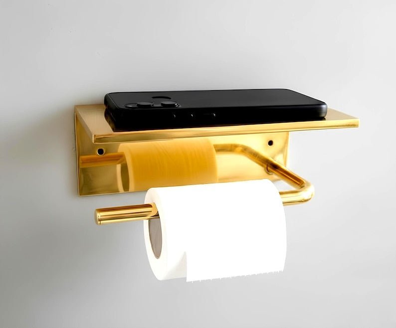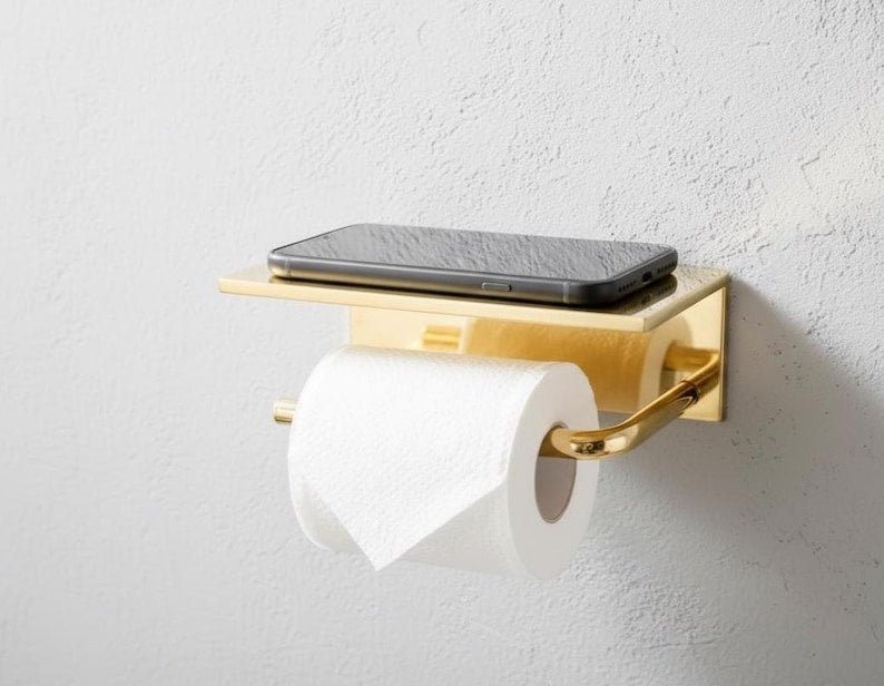 Authentic, reliable and transparent – your satisfaction is our absolute priority. Our team is always available to support you. This solid brass toilet paper holder with a top shelf combines elegance and functionality. Its sturdy wall-mounted design provides durability, while the polished brass finish adds a touch of luxury to any bathroom. The convenient flat shelf offers extra space to keep your phone, wipes, or small accessories within easy reach. Handmade with premium quality brass, this piece will naturally develop a beautiful patina over time, making it both practical and timeless.