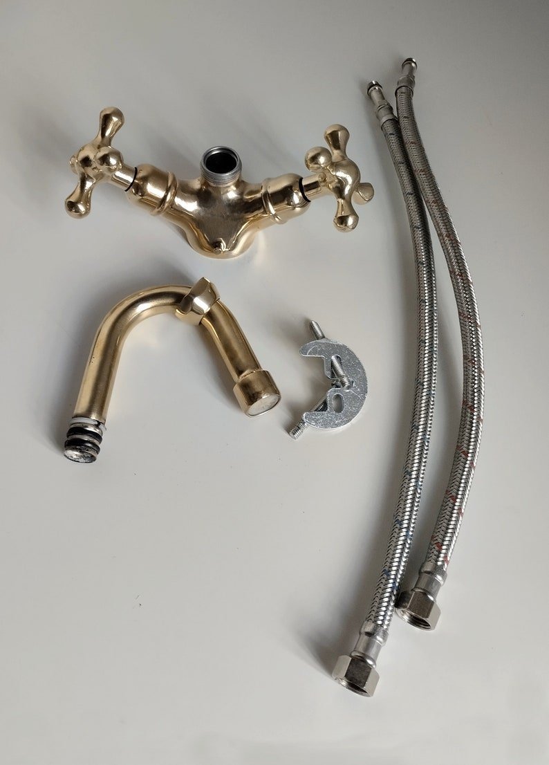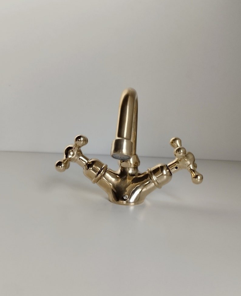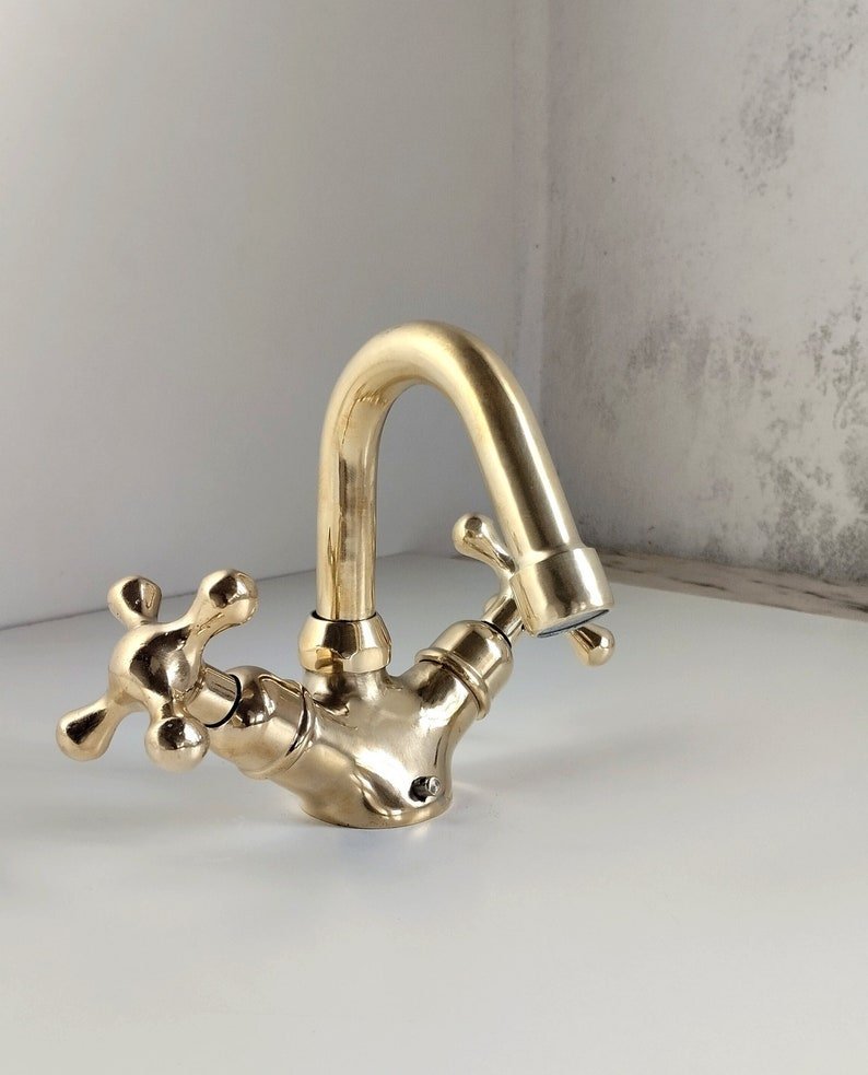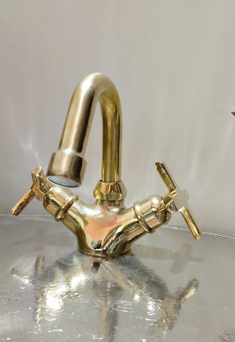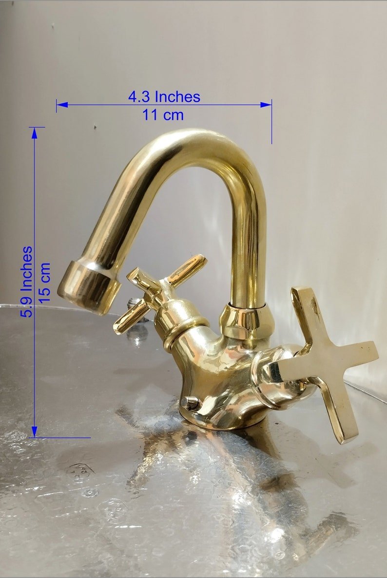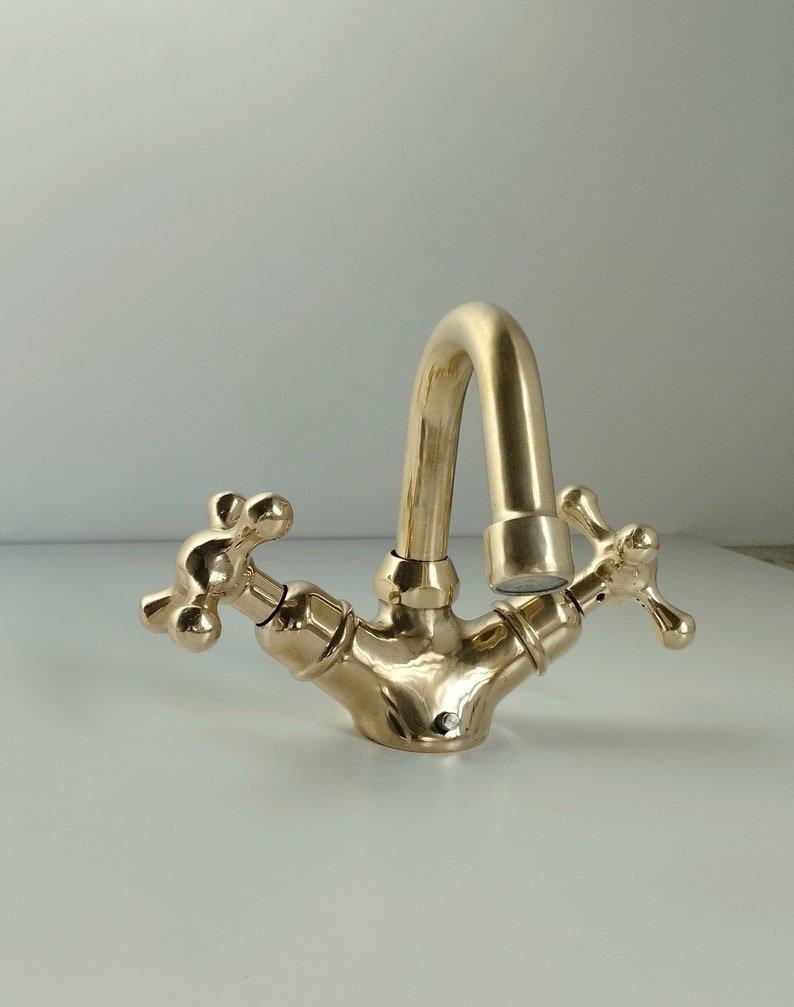 The Unlacquered Brass Bathroom Faucet is a high-quality, durable faucet made from solid brass material. It has a natural, unlacquered finish that will develop a warm patina over time, giving it a unique and elegant look. The faucet features a classic design and is ideal for traditional or vintage-style bathroom designs. It is easy to install and use, making it a practical and attractive addition to any bathroom.