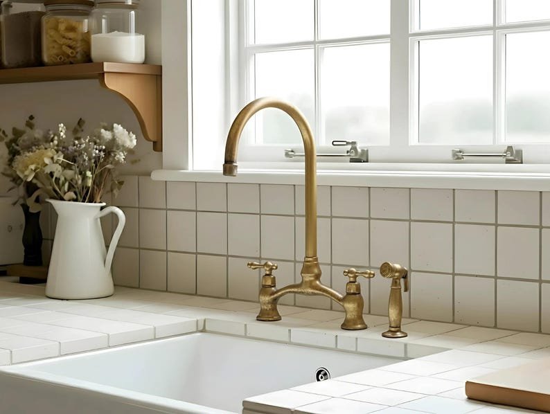 Ready to transform your kitchen into a space of elegance and style? Our Unlacquered Brass Bridge Faucet is designed to be the centerpiece of any kitchen, offering both durability and timeless appeal. Crafted from premium certified brass.
