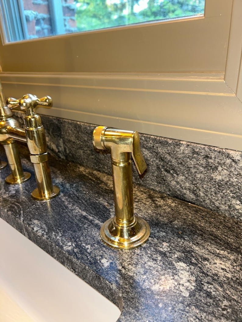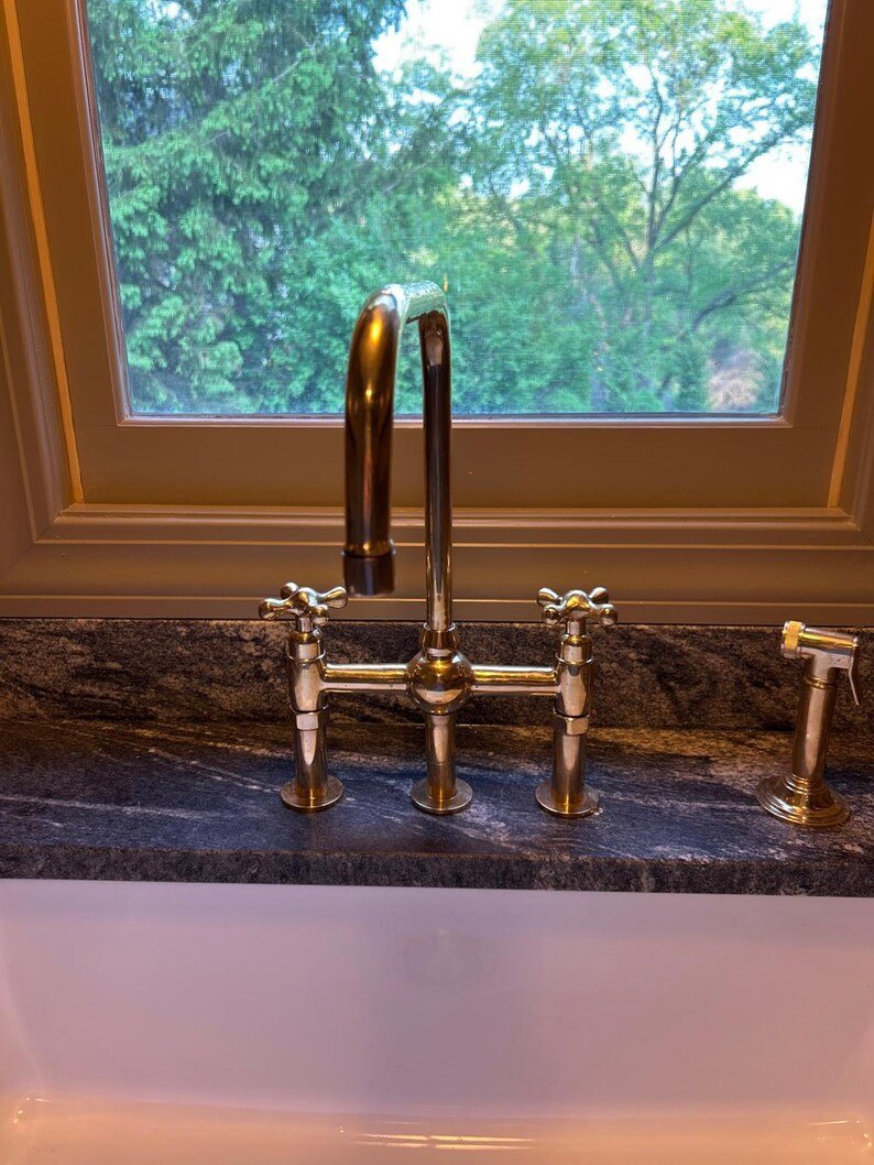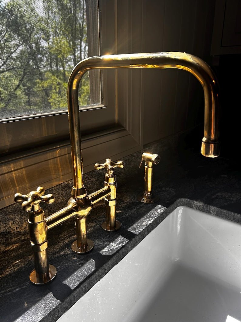 Give your kitchen a modern edge with this center ball bridge faucet in unlacquered brass .