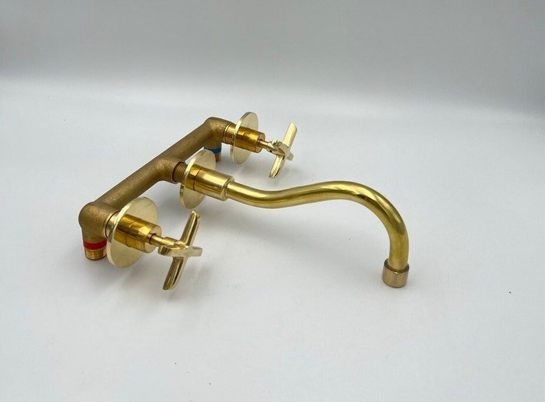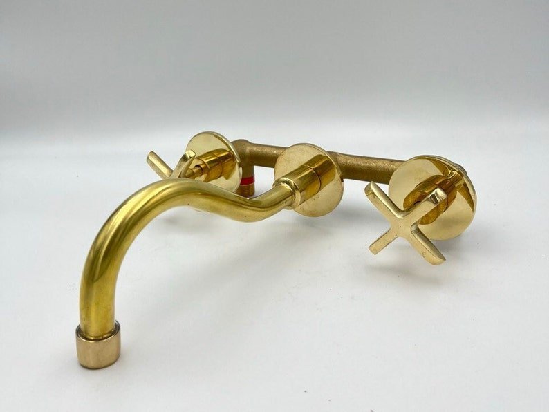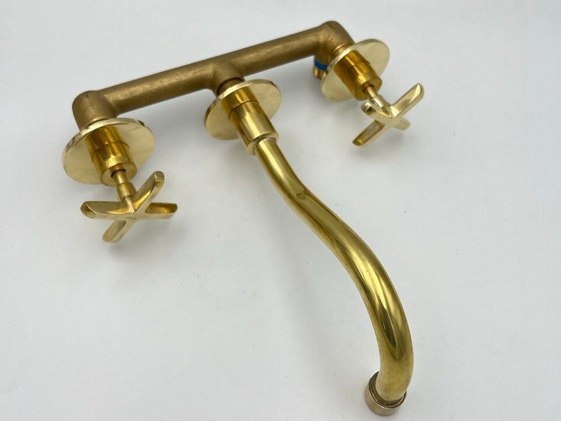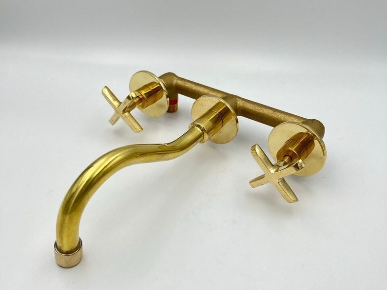 Unlacquered Brass Wall Mount Bathroom Faucet: Curved Spout, 8-Inch Reach