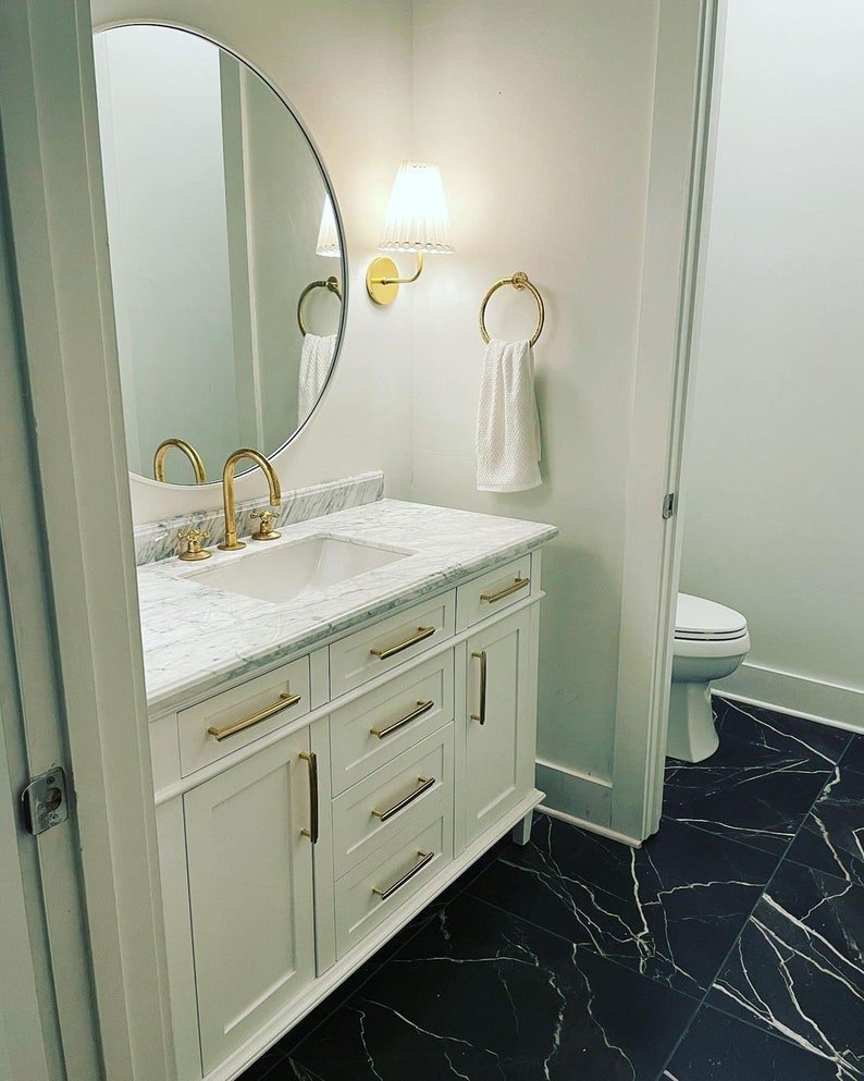 ‘- Unlacquered Brass Finish: Develops patina over time. This is a natural aging process. Faucet is delivered with a shiny polished look, then will start to patina with time.